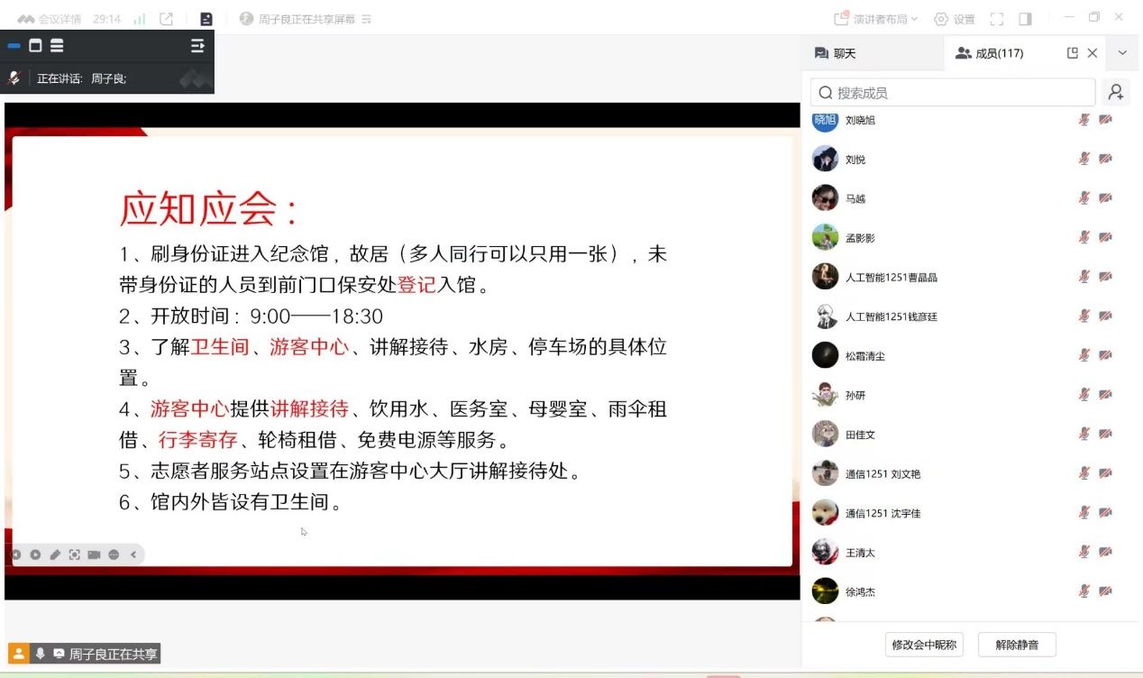 活动前期,芯青年志愿者队通过线上培训的形式,为参与的志愿者系统讲解了志愿服务流程、岗位职责、礼仪规范等等。培训中,队长们结合纪念馆与故居的实际服务场景,针对票检核对、游客引导、环保清洁等关键环节进行指导,为志愿服务的高效开展筑牢基础。