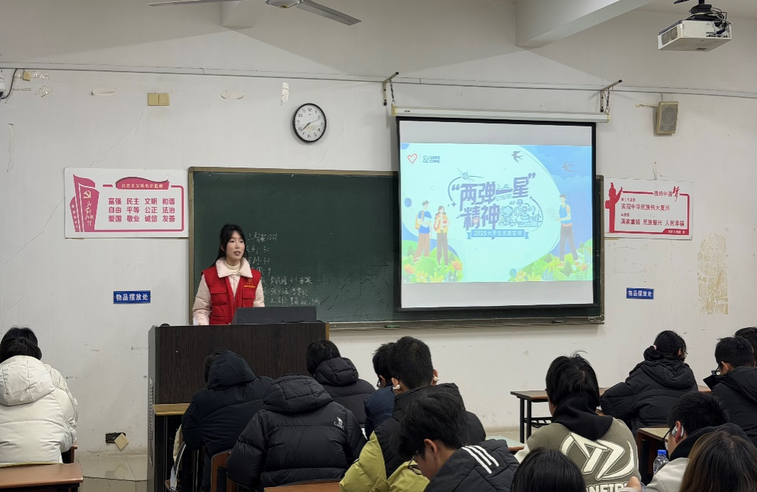 致敬戈壁丰碑,传承奉献之志。在讲述“两弹一星”精神时,宣讲人朱梦笑带领大家回顾了那段激情燃烧的岁月。从茫茫戈壁中的坚守,到科研攻关时的日夜奋战,郭永怀、王淦昌等杰出科学家隐姓埋名、无私奉献的事迹令人动容。朱梦笑结合“热爱祖国、无私奉献,自力更生、艰苦奋斗,大力协同、勇于登攀”的精神内涵,鼓励同学们将个人理想融入国家发展,以担当和奉献书写青春篇章。
