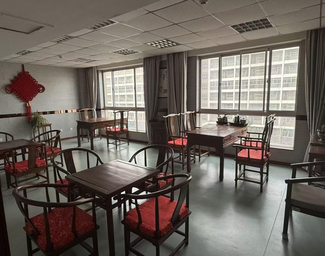 在老人生活区,志愿者们看到宽敞明亮的活动室内摆放着古典雅致的中式家具,圆形拱门博古架将空间巧妙分隔,既保留了传统中式建筑的韵味,又营造出温馨的家庭氛围。在这里,他们可在茶室品茗畅谈,亦可相聚下棋,晚年生活安详而充实。