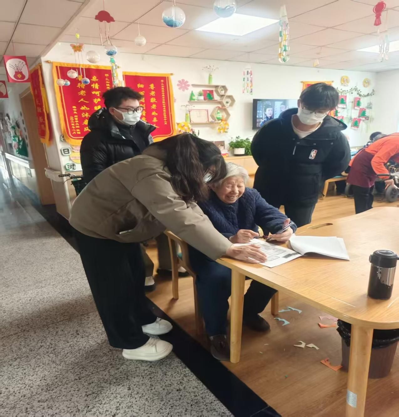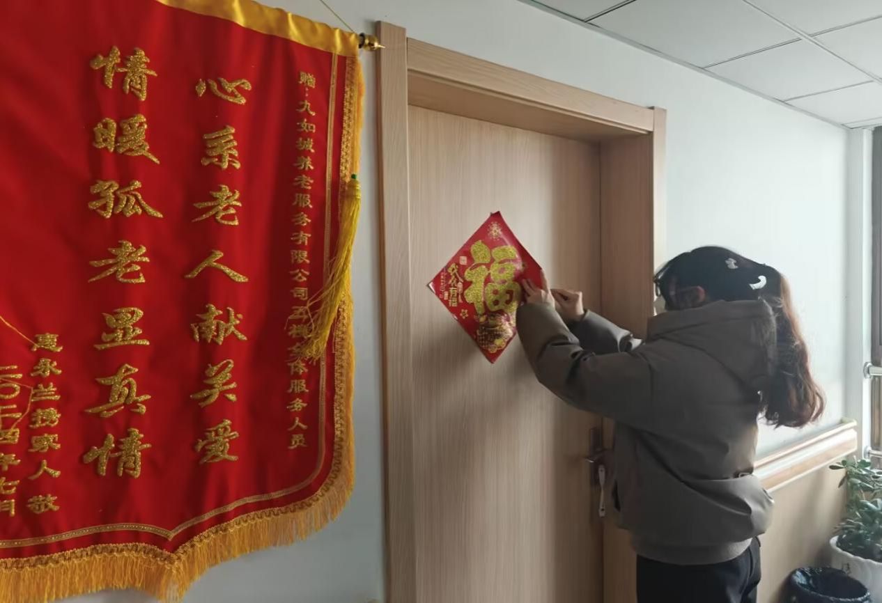 张灯结彩,喜迎新年。为营造浓厚温馨的节日氛围,实践团成员分工协作,贴窗花、挂灯笼、贴福字。红彤彤的装饰将养老院装点得格外温馨热闹,老人们看着满院喜庆祥和的布置,脸上洋溢着幸福满足的笑容,也提前感受到了浓浓的年味。