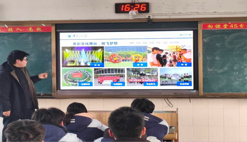 重踏故园,在熟悉教室传递温暖。冬日的淮海中学校园暖意融融,实践团成员们站在曾经奋斗过的教室前,心中满是感慨与责任。宣讲过程中,成员们结合自身大学生活经历,用生动鲜活的案例,从大学学习模式、专业特色、校园文化等方面展开分享,全方位展现了丰富多彩的高校生活。针对学弟学妹们最为关注的备考阶段心态调整、时间管理技巧,以及志愿填报的实用方法,成员们毫无保留地倾囊相授,既有可落地的具体策略,也有贴合高中生活的真切感悟。当讲到大学社团中的科创项目、实践活动时,台下学弟学妹们眼中闪烁的好奇与向往之光,让实践团成员真切感受到了分享的价值与意义。