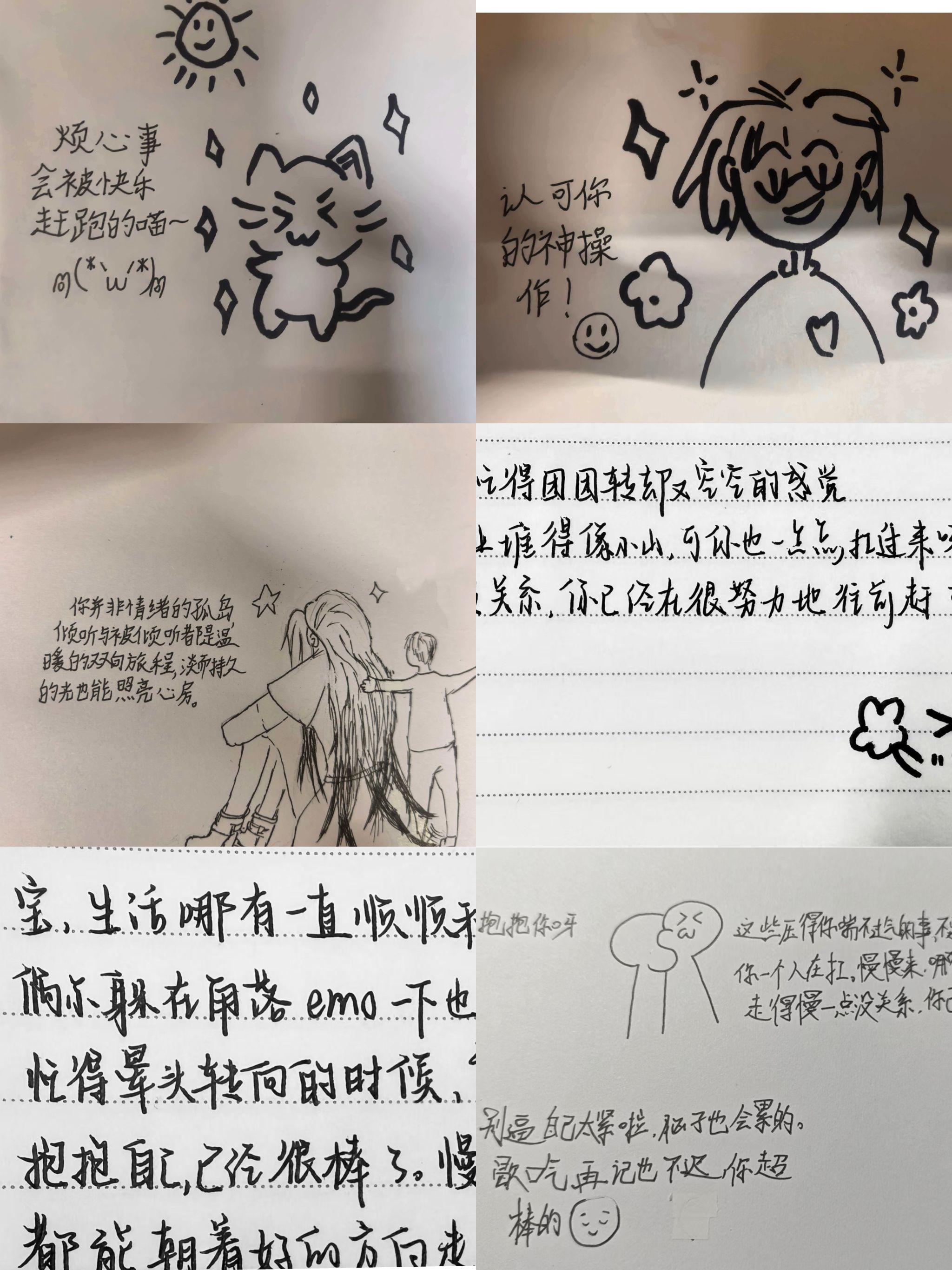 活动期间,同学们积极参与、真诚倾诉,在纸笔与涂鸦间梳理心绪起伏,将烦恼、委屈与压力转化为可触摸的文字与画面。一份份投递的作品,既是情绪的出口,也是同学们对自我的接纳与和解;心理部成员写下的每一句回应,都传递着理解与陪伴的温度,为同学们注入温暖的力量。这些作品不仅展现了同学们真实细腻的内心世界,更彰显了电信学子直面情绪、向阳生长的积极心态。