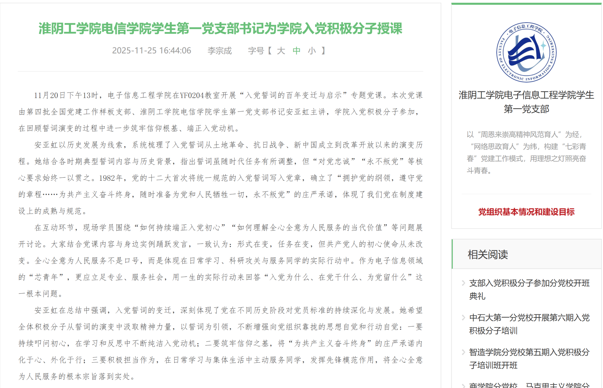 11月20日下午13时,电子信息工程学院在YF0204教室开展“入党誓词的百年变迁与启示”专题党课。本次党课由第四批全国党建工作样板支部、淮阴工学院电信学院学生第一党支部书记安亚虹主讲,学院入党积极分子参加,在回顾誓词演变的过程中进一步筑牢信仰根基、端正入党动机。