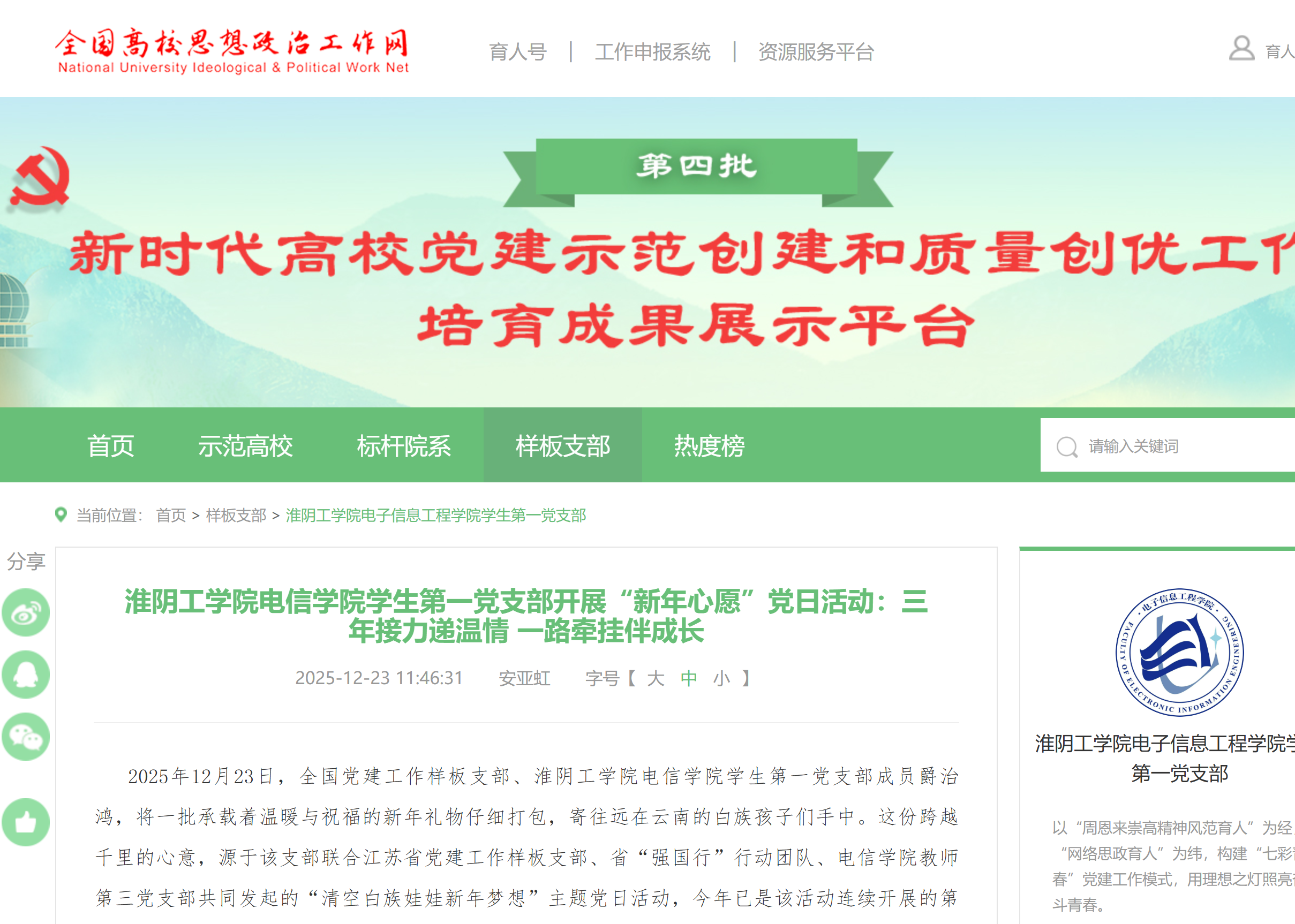2025年12月23日,全国党建工作样板支部、淮阴工学院电信学院学生第一党支部成员爵治鸿,将一批承载着温暖与祝福的新年礼物仔细打包,寄往远在云南的白族孩子们手中。这份跨越千里的心意,源于该支部联合江苏省党建工作样板支部、省“强国行”行动团队、电信学院教师第三党支部共同发起的“清空白族娃娃新年梦想”主题党日活动,今年已是该活动连续开展的第三年。
