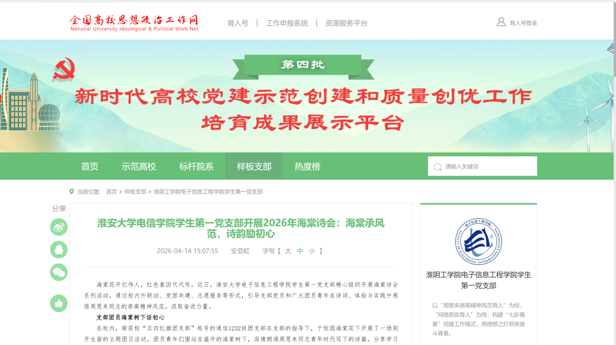 此次海棠诗会系列活动,是淮安大学电信学院学生第一党支部深化“周恩来崇高精神风范育人”品牌建设的重要举措。通过“校内+校外”“学习+体验+实践”的多元形式,将红色教育融入春日美景、艺术熏陶与志愿服务之中,有效提升了党建和思想政治工作的感染力与实效性。支部将持续挖掘周恩来崇高精神风范的时代价值,引导广大师生在追忆伟人中砥砺品格,在传承精神中奋发作为。