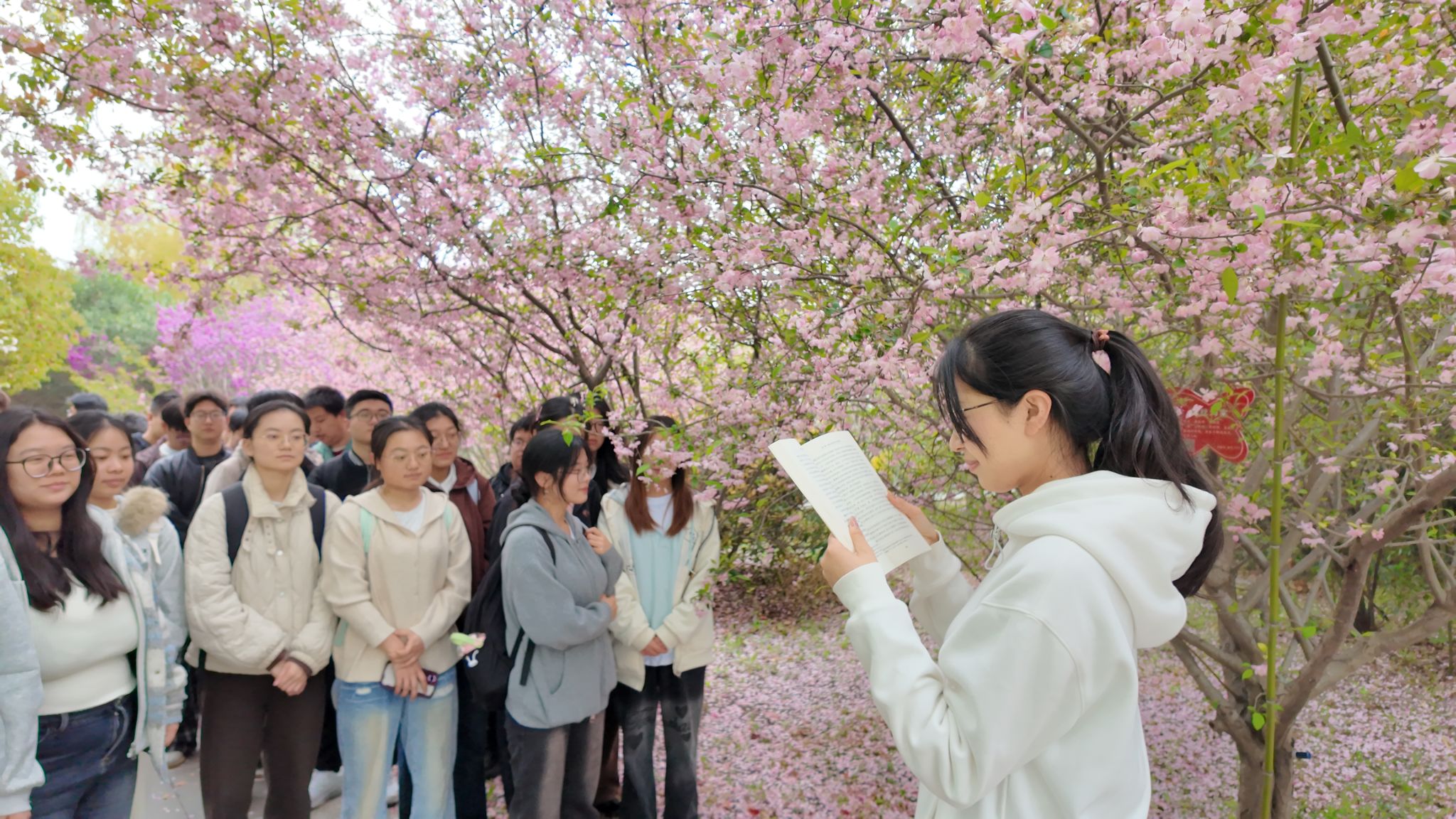 在校内,荣获校“五四红旗团支部”称号的通信1232班团支部在支部的指导下,于校园海棠花下开展了一场别开生面的主题团日活动。团员青年们围站在盛开的海棠树下,深情朗诵周恩来同志青年时代写下的诗篇,分享学习周恩来崇高精神风范的心得体会。